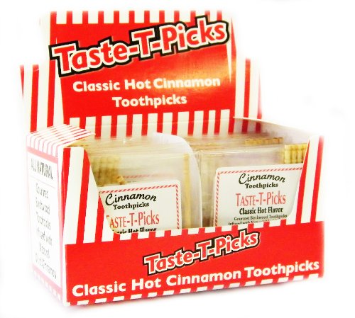 These Hot Cinnamon Toothpicks are all natural and sugar free - made from gourmet birchwood toothpicks infused with natural oil of cinnamon. Sturdy round toothpick with pointed end & more intense real cinnamon flavor than the obsolete Harmon's Hot Pix. Plus, NO artificial flavoring or sweetners! DOUBLE DIPPED for extra HOT flavor!Many people use our cinnamon toothpicks, not only to cleanse the mouth after eating, but to help curb the urge to snack & smoke. Approx. 6 hot pix per pack. 36 ct.More picks for your bucks ~ Taste T picks cinnamon toothpicks are almost half the price per toothpick of other brands. Plus: NO artificial flavors, NO sweeteners, NO artificial colors. RelateItems- Taste-T-Picks Cinnamon Toothpicks, 12-Count Package (Total 180 Picks)